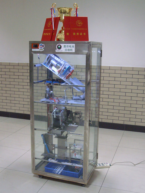 “废旧电池回收机”指导教师为光电创新教育基地张忠廉老师和2004级学生周成龙。其中,周成龙同学曾获第二届全国大学生机械创新设计大赛全国一等奖。本参赛队由信息科学技术学院、宇航科学与技术学院和机械与车辆工程学院2005级本科生宋哲、占云志、江长春、龚晶、张希组成。