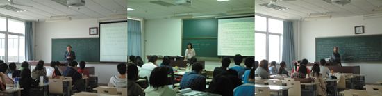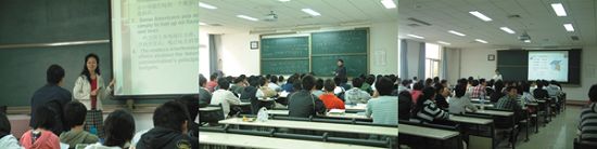 教师们在认真授课,他们中有教学名师、教授、青年教师、外教,课堂上每位教师深入浅出、循循善诱,引导学生认真学习。